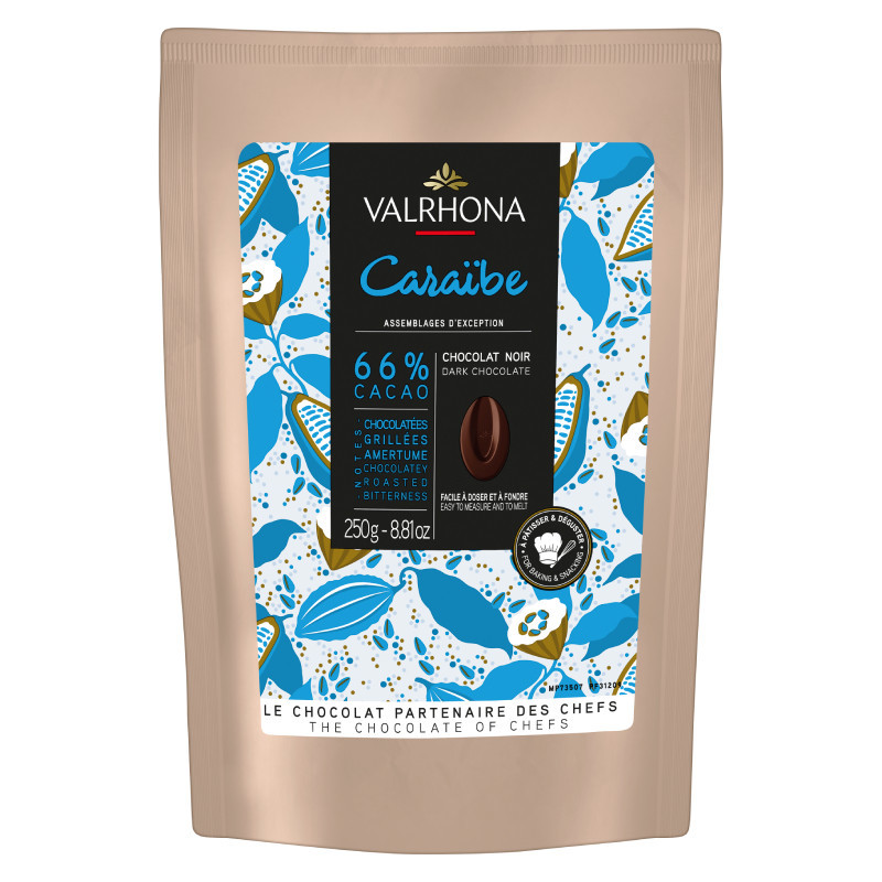 Fèves de chocolat noir Valrhona Caraïbe 66% de cacao, Mariage de Grands Crus.